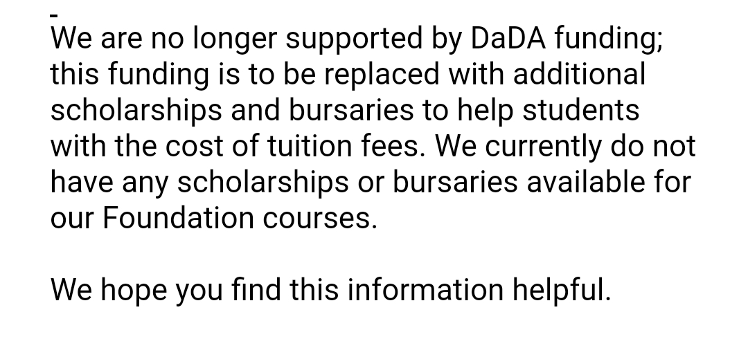 We are no longer supported by DaDA funding; this funding is to be replaced with additional scholarships and bursaries to help students with the cost of tuition fees. We currently do not have any scholarships or bursaries available for our Foundation courses.