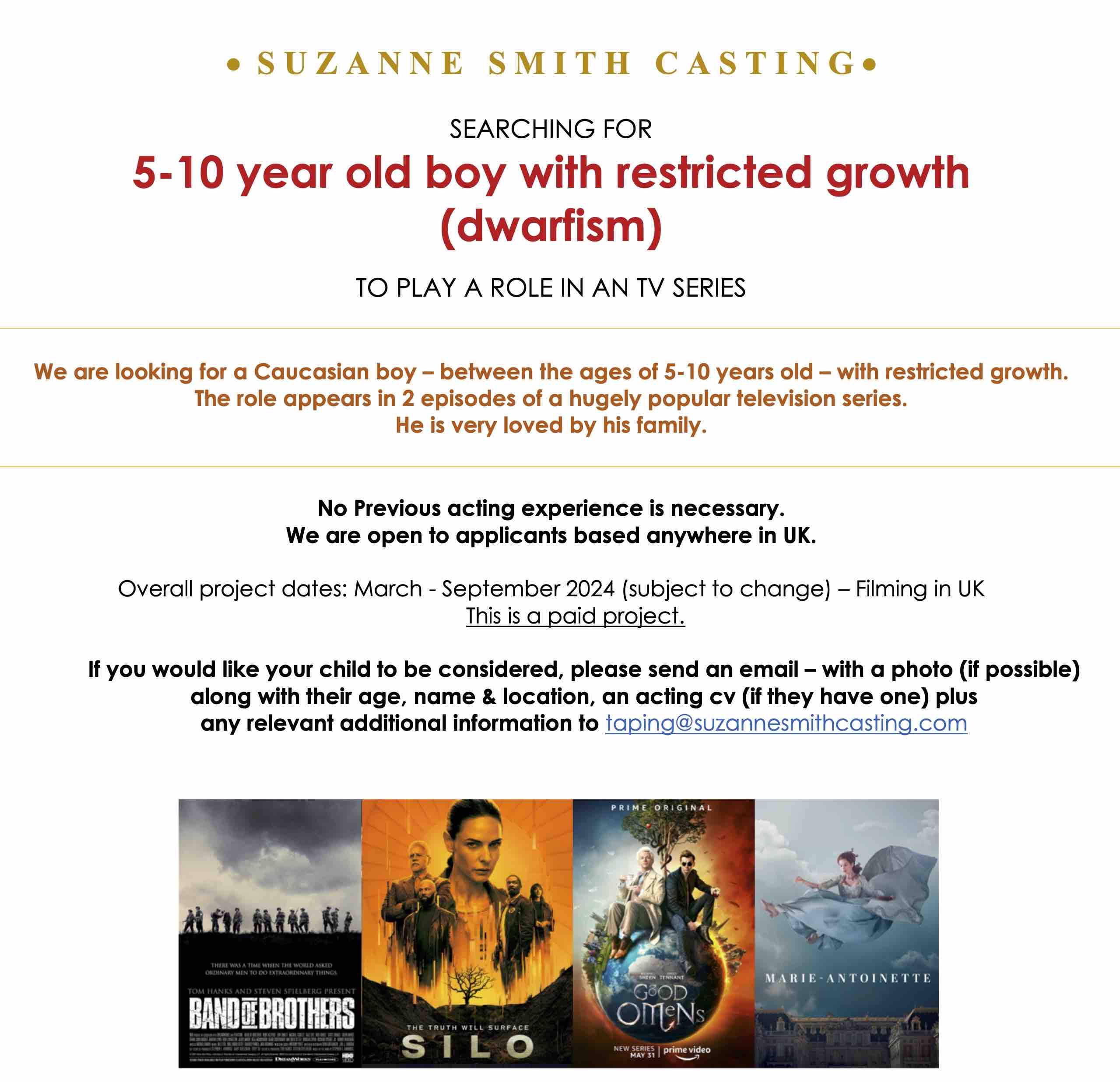 Suzanne Smith Casting is looking for a child with restricted grown (dwarfism) to play a role in a TV series.